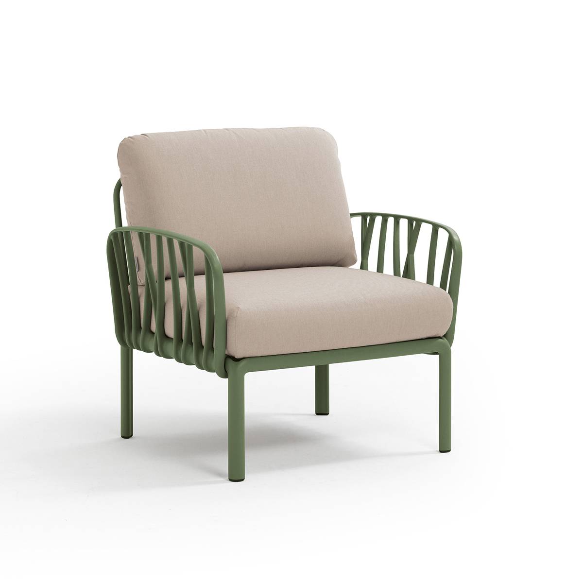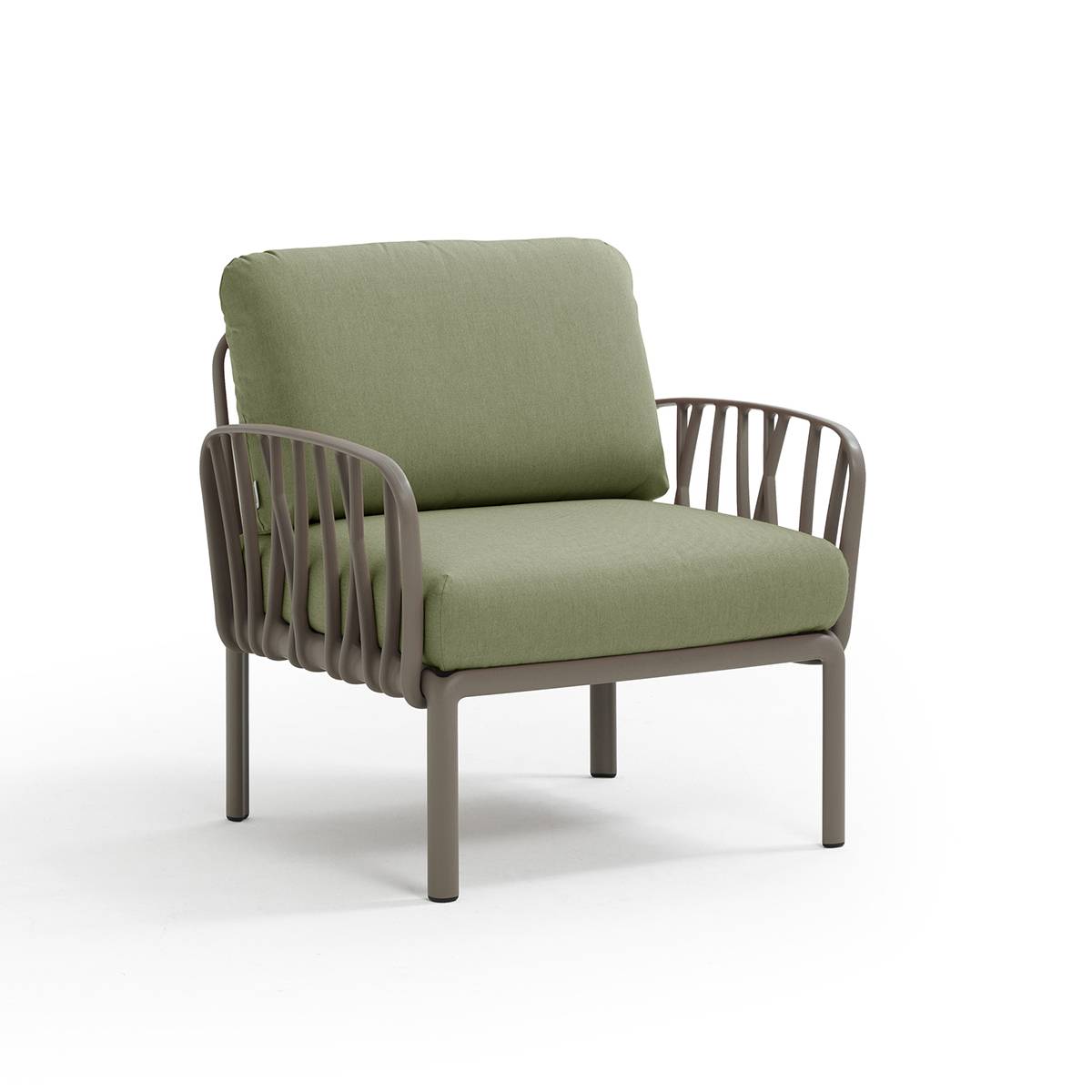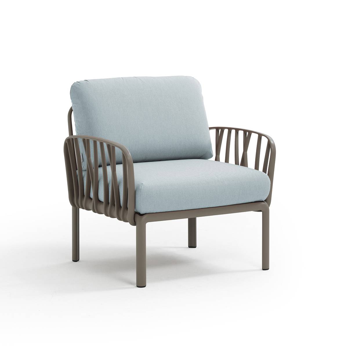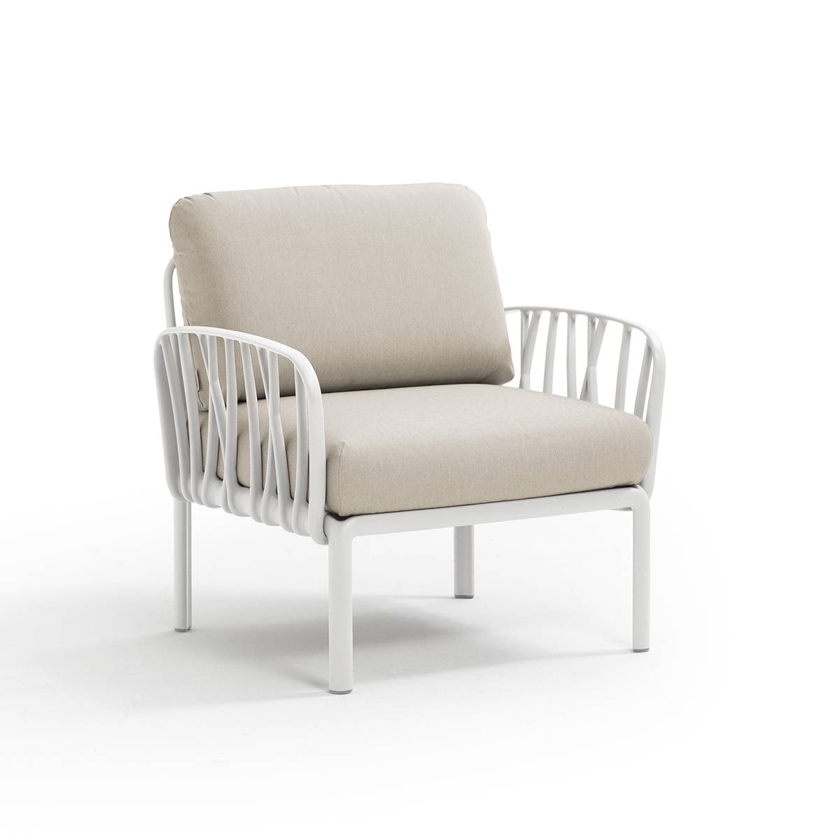 Rilassante poltrona con braccioli in resina fiberglass e imbottiti. Acquistabile singolarmente o progettabile come elemento compositivo in set più ampi previsti dalla collezione di sedute modulari Komodo.